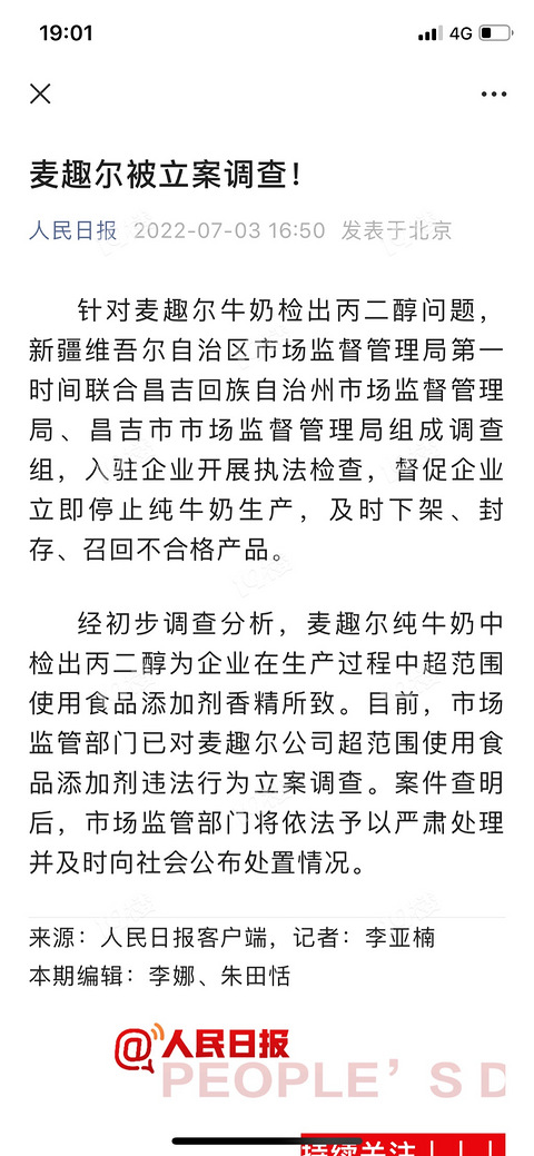 麦趣尔被立案调查!纯牛奶中丙二醇超标!刚致电美丽家...