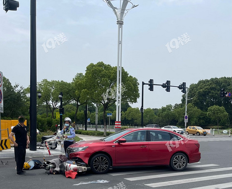 6月9日下午一点不到的时候,在由拳路纺工路口发生一起交通事故,一辆红色轿车和一辆电瓶车在斑马线前面相撞,电瓶车驾驶员躺在地上。过了几分钟,看到救护车也来了,希望人没事!