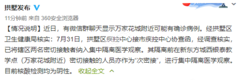 近日,有微信群聊天显示万家花城附近可能有确诊病例。经拱墅区卫生健康局核实:7月31日,拱墅区疾控中心接市疾控中心协查函,经调查核实,已将辖区两名密切接触者纳入集中隔离医学观察。 其隔离前在新东方城西银泰教学点(万家花城附近)密切接触的人员亦作为“次密接”,进行集中隔离医学观察。目前核酸检测均为阴性。