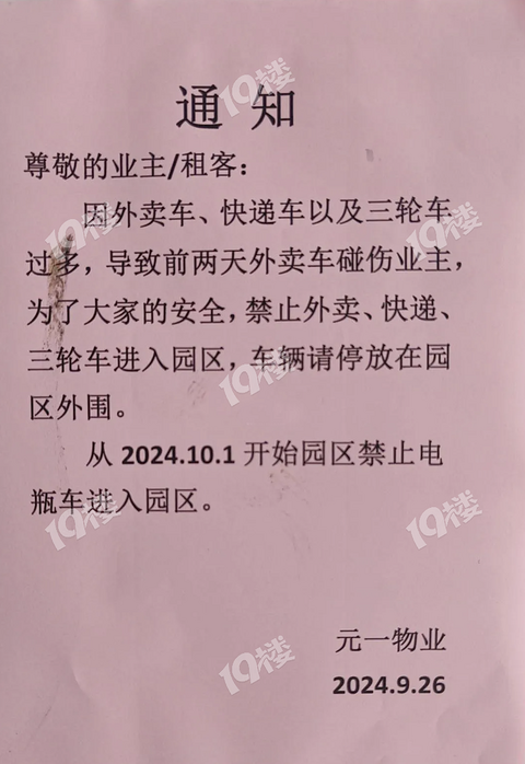 元一也算是老“网红”小区了,现在因为前两天外卖车碰撞到业主了,开始发布紧急通知,严令禁止外卖车、快递车、三轮车进入园区了。。。虽然现在人车分流的新小区很多,但规模面积相对来说没有元一柏庄大,难道要让业主自己步行老远出去拿外卖拿快递吗?哪怕是让小哥送进来,这个小区也马上会被外卖员拉黑名单吧?你们觉得是不是太极端了啊?难道物业就想不出其他的办法了吗?要点外卖、取快递、装修需要三轮运输的业主怎么办??