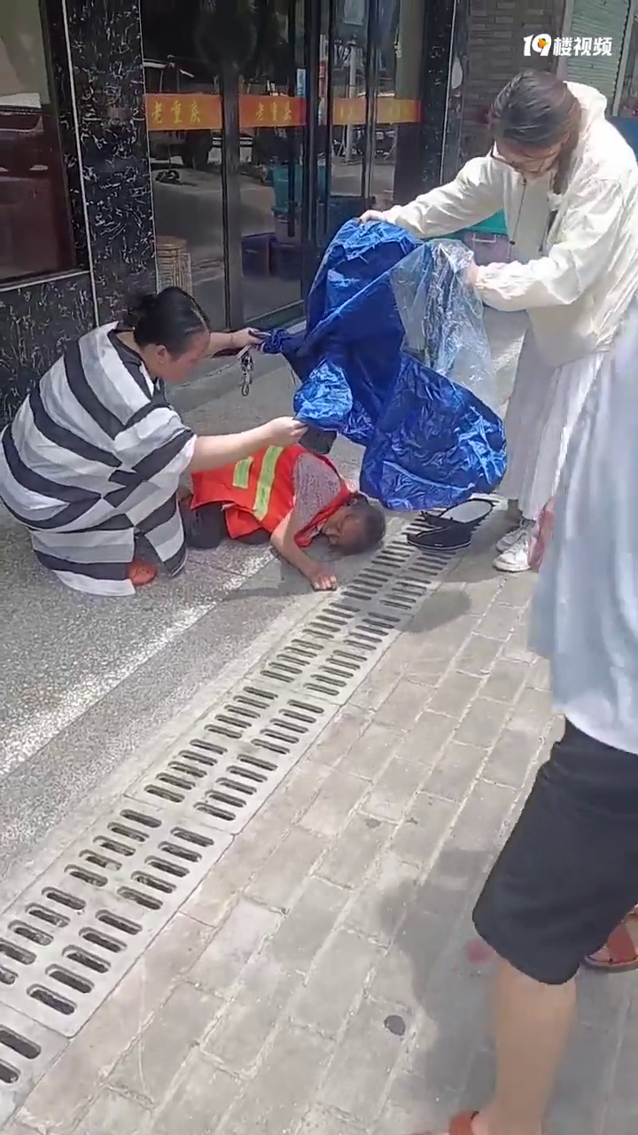 桐乡,是个六七十岁的老太太,中暑倒地感觉很危险啊!不过还是好人多,边上的好心人拿雨衣遮挡阳光,有的打救护车电话号码,有的用扇子扇风……据说后来救护车来了应该没大事!