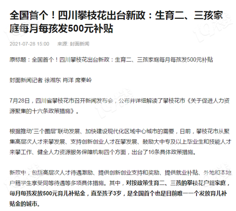 7月28日,攀枝花市政府召开新闻发布会,发布并详细解读了攀枝花市《关于促进人力资源聚集的十六条政策措施》。新政中最为突出的一个亮点,便是育儿补贴金。这也是全国首个发放实施的城市。攀枝花市将对按政策生育第二个及以上孩子的攀枝花户籍家庭,每月每孩发放500元育儿补贴金,直至孩子3岁,真金白银解决孩子的“奶粉钱”。