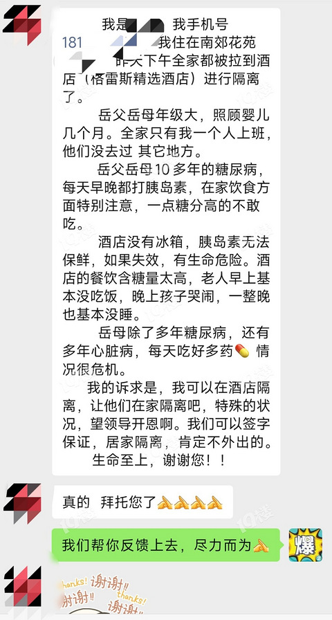 今天10点多,有家住南郊花苑的网友联系到嘉兴爆料王,表示自己遇到难事儿,想爆料王能不能支支招。 沟通了解到,南郊花苑因疫情防控需要划了三区,而网友一家子都需要去酒店集中隔离。因为家人有疾病需要每天打胰岛素,胰岛素需要冷藏,而隔离酒店条件暂时不具备相应的条件,所以他想老人回到小区居家隔离。 了解到网友诉求后,19楼第一时间反馈给了长水街道有关部门,和相关负责人联络对接此事!很快,街道方面就回复表示已