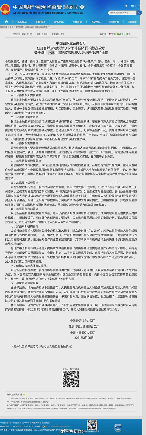 中国银保监会办公厅、住房和城乡建设部办公厅、中国人民银行办公厅发布关于防止经营用途贷款违规流入房地产领域的通知。