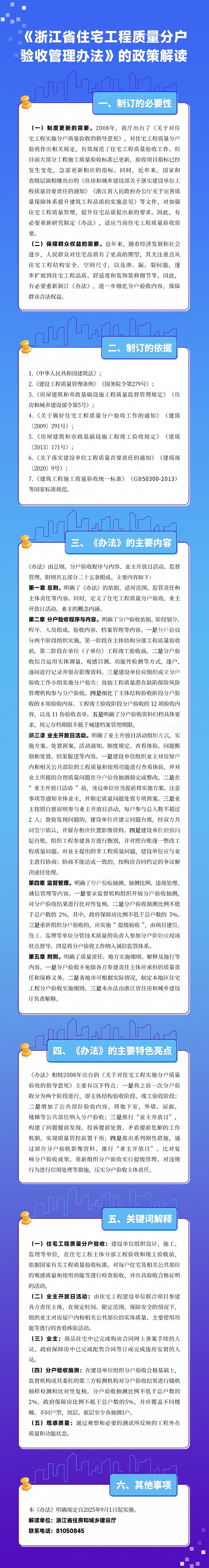 为进一步加强住宅工程质量管理,压实工程参建各方主体责任,保障工程主体结构安全和主要使用功能,减少工程质量常见问题,提高住宅工程质量总体水平,省建设厅近日印发《浙江省住宅工程质量分户验收管理办法》,自2025年9月1日起实施。