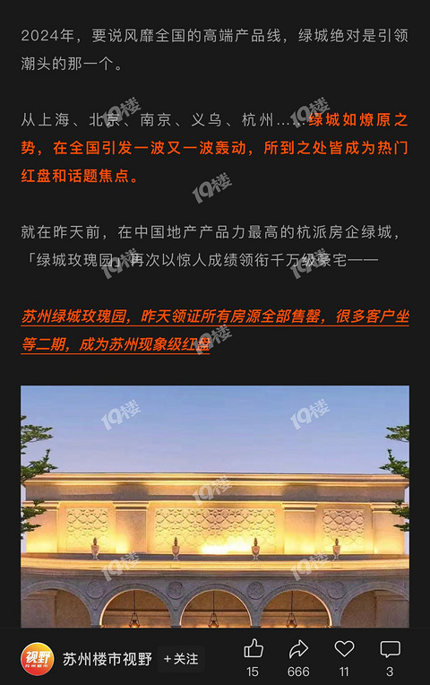 经常关注苏州楼市,要知道苏州楼市有多惨,身在嘉兴的各位可能有所不知,苏州楼市从2018年巅峰后,一直下跌,到今年持续了6年,当我们嘉兴2020-2021年暴涨两年的时候,苏州还是在下跌。所以感慨下,绿城中国真是豪宅专家,现在这种超级大熊市叠加苏州的楼市大背景的情况下,能将“品质溢价+销售速度”完美结合的,真的也就只有绿城中国了。