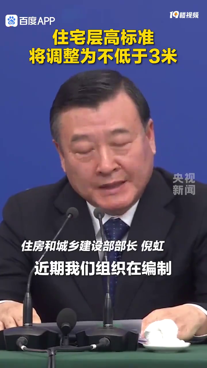 住建部部长倪虹:住宅层高标准将调整为不低于3米