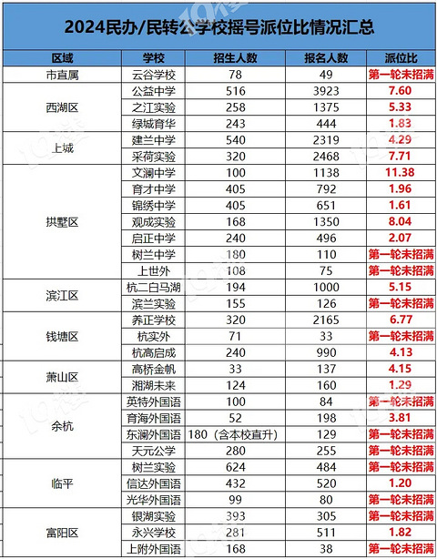 昨天某公众号发布了一张2024年杭州民办\民转公学校摇号派位比情况,如下数据上看1,很多民办学校第一轮未招满;2,部分热门民转公派位比爆了,后期可能会分流! 今年的热度并不在传统民办初中,而是集中在民转公学校。民转公学校缘何受热捧? 一来这些学校原本就是热门民办出身。 二来这些学校转公后,一方面可以免学费,另一方面,又延续原民办方式招生,没有学区限制,所属区内小学毕业生都能报名,而且班额等方面也延