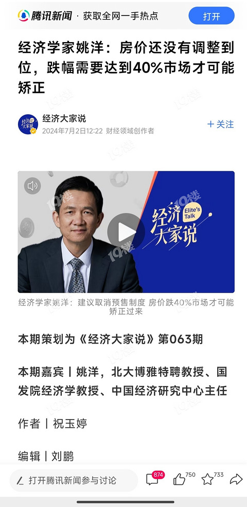 经济学家姚洋:房价还没有调整到位,跌幅需达40%市场才能矫正