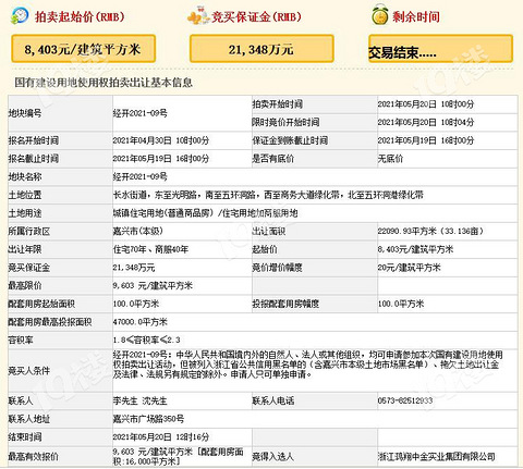 中国网地产讯 5月20日,浙江省嘉兴市集中出让13宗涉宅用地,总出让面积939亩,总建筑面积128.37万平,总起价90.96亿元。经过105轮竞价,浙江鸿翔中金实业集团有限公司(鸿翔)以上限价格4.88亿元竞得经开2021-09号地块,楼面价9603元/㎡,溢价率14.28%,竞配人才房面积16000㎡(占总建面31.5%)。资料显示,该地块位于嘉兴经开区长水街道,东至光明路,南至五环洞路,西