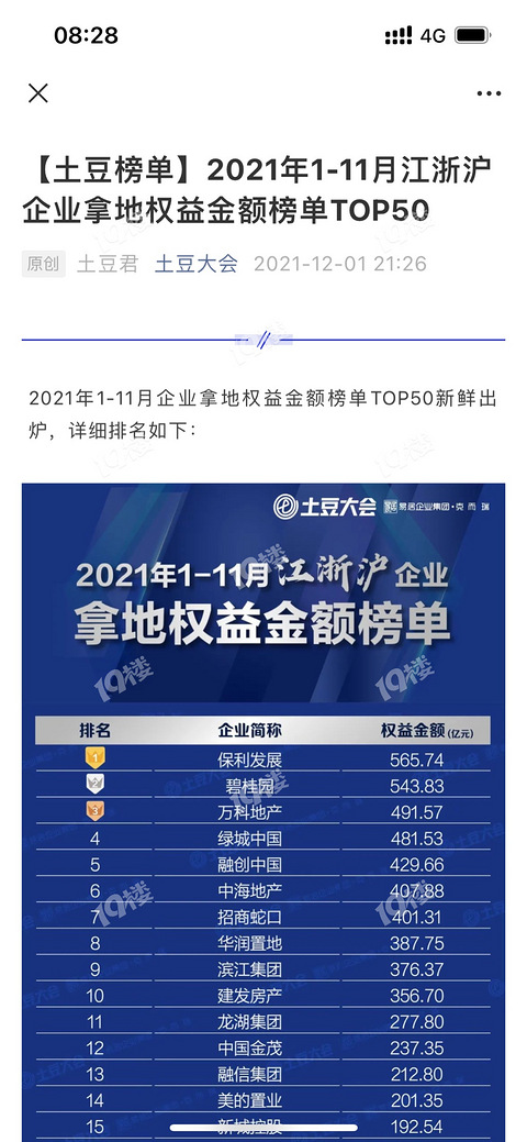 2021年1-11月江浙沪企业拿地权益金额榜单TOP50