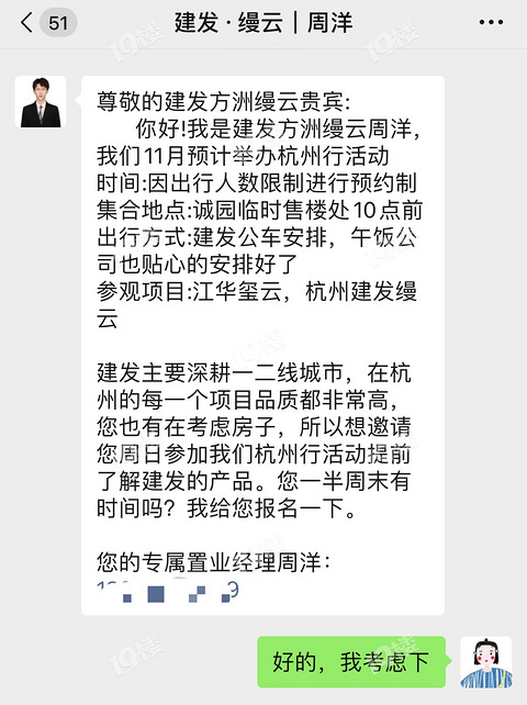 前几天去看了建发缦云这个楼盘 今天销售和我说有个杭州行活动,可以去杭州参观建发已经交付的小区,有没有想去的搭子可以一起去呀[/11大叫]