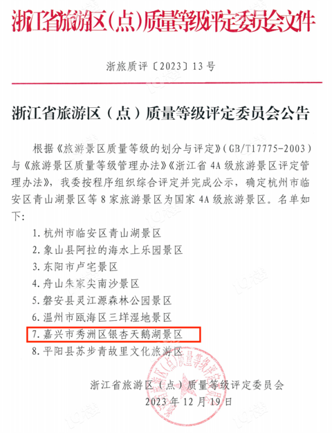 日前从省文旅厅传来好消息!嘉兴市秀洲区银杏天鹅湖景区正式被评为国家AAAA级旅游景区! 这是秀洲区首家国家4A级景区!!!