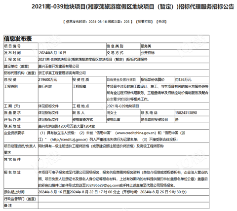 2021南-039地块项目(湘家荡旅游度假区地块项目(暂定))发布招标代理服务公告,建设单位为嘉兴玉衡开发建设有限公司。 项目总投资21.96亿元,工程规模包括本项目中涉及的施工图设计、施工、与本项目有关的第三方服务类等所有全过程招标代理服务、工程量清单及招标控制价编制服务及配合业主要求的询价等相关工作。 该地块位于湘家荡西岸,东侧紧靠北辰路,距离湘家荡较近,北面沿水系,一河之隔是鸣庐府小区,南侧