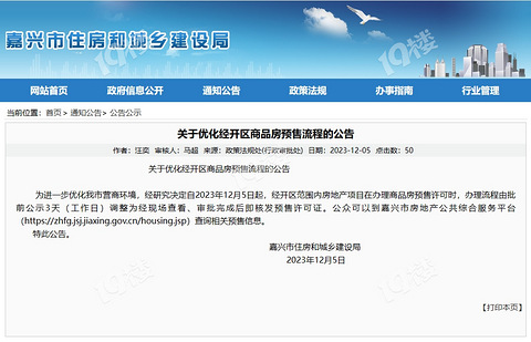 关于优化经开区商品房预售流程的公告为进一步优化我市营商环境,经研究决定自2023年12月5日起,经开区范围内房地产项目在办理商品房预售许可时,办理流程由批前公示3天(工作日)调整为经现场查看、审批完成后即核发预售许可证。公众可以到嘉兴市房地产公共综合服务平台(https://zhfg.jsj.jiaxing.gov.cn/housing.jsp)查询相关预售信息。