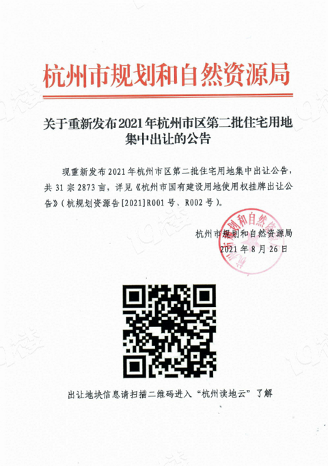 8月26日,杭州市重新发布了2021年第二批住宅用地集中出让公告(杭规划资源告[2021]R001号、R002号),涉及的出让地块不变,共31宗,面积2873亩。此次集中出让与之前相比,主要作了以下调整: 一是明确竞买人必须具备一年以上房地产开发资质;二是明确同一集团成员企业不得同时报名竞买(或联合竞买)同一地块,除“竞品质”地块外,同一集团成员企业最多只能参与5宗地块竞买。 一是一般地块溢价率上