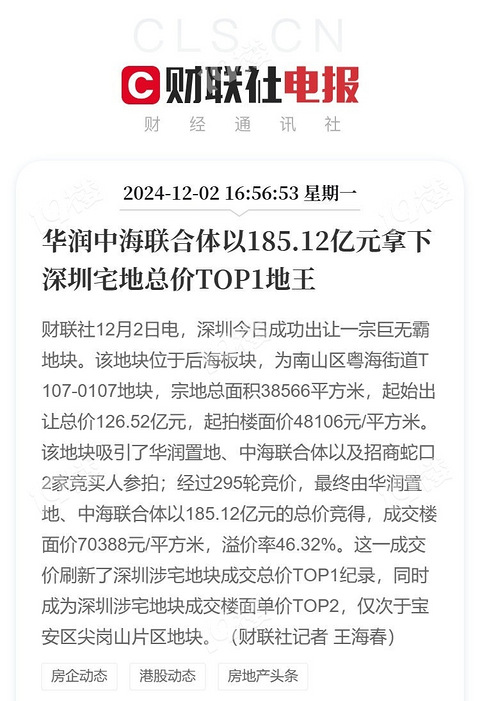 华润中海联合体185.12亿元拿下深圳宅地总价TOP1地王!