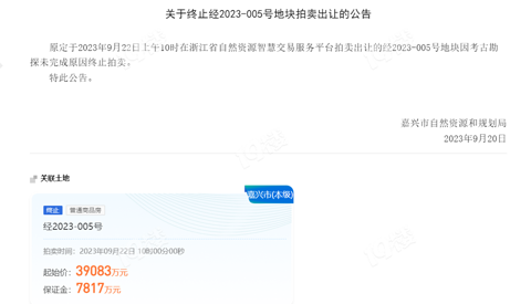 嘉兴922土拍作为今年下半年,最引人注目的土拍!昨天,嘉兴自规局发布公告,原定于2023年9月22日上午10时出让的经2023-005号地块、经2023-006号地块,因考古勘探未完成原因终止拍卖。地块详情见:又挂地?!经开区三宗宅地将于9月出让! 922土拍仅剩一根独苗!↓↓↓经2023-007号地块 起始楼面价8698元/㎡,出让面积16364㎡,最大容积率仅有1.33,计容建面约2.18万方
