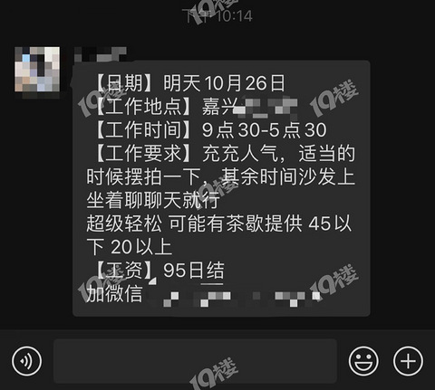 兼职群里看到的,嘉兴楼盘已经开始雇人 充人气了?工资日结95!明码标价啊!看来是真的不行了呀…我还以为这些楼盘已经卖完了……45以下,20以上,还有年龄要求也算朝九晚五,一天95有点少了…
