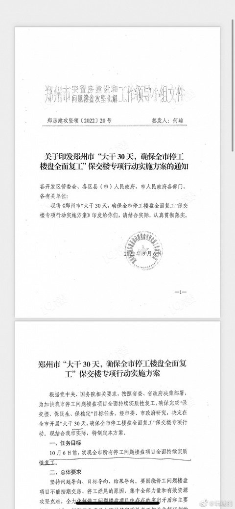 中国基金报消息,9月7日,一则落款为“郑州市安置房建设和问题楼盘攻坚化解工作领导小组”的通知瞬间被传播开来,文件标题为:关于印发郑州市“大干30天,确保全市停工楼盘全面复工”保交楼专项行动实施方案的通知。 据“通知”内容,10月6日前,实现郑州全市所有停工问题楼盘项目全面持续实质性复工。将按照问题导向、目标导向、结果导向的要求,围绕停工问题楼盘项目不能按期交房、停工烂尾的原因,集中全部力量和有效资