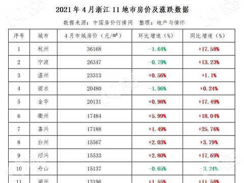 2021年4月浙江11地市房价及涨跌数据,同比增速嘉兴第一