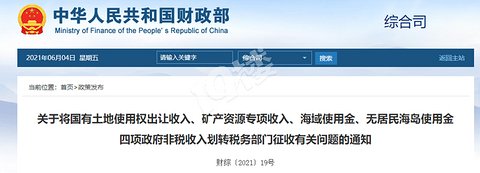 财政部昨晚突然发布通知:《关于将国有土地使用权出让收入、矿产资源专项收入、海域使用金、无居民海岛使用金四项政府非税收入划转税务部门征收有关问题的通知》。 通知指出,将由自然资源部门负责征收的国有土地使用权出让收入、矿产资源专项收入、海域使用金、无居民海岛使用金四项政府非税收入(以下简称四项政府非税收入),全部划转给税务部门负责征收。自然资源部(本级)按照规定负责征收的矿产资源专项收入、海域使用金