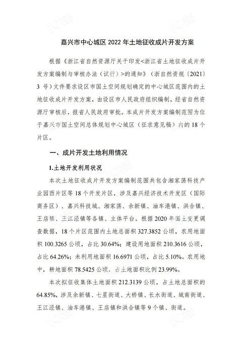 近日,嘉兴市自然资源和规划局发布了征收成片开发方案,涉及中心城区的18个片区。征收片区主要是集中在高铁新城、湘家荡和油车港。 原文如下: 湘家荡主要征收片区: 油车港主要征收片区: 王江泾主要征收片区: 科技城主要征收片区: 高铁新城主要征收片区: 洪合王店主要征收片区: