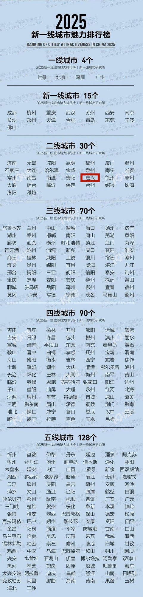 2025年新一线城市排名出炉!嘉兴稳居二线!