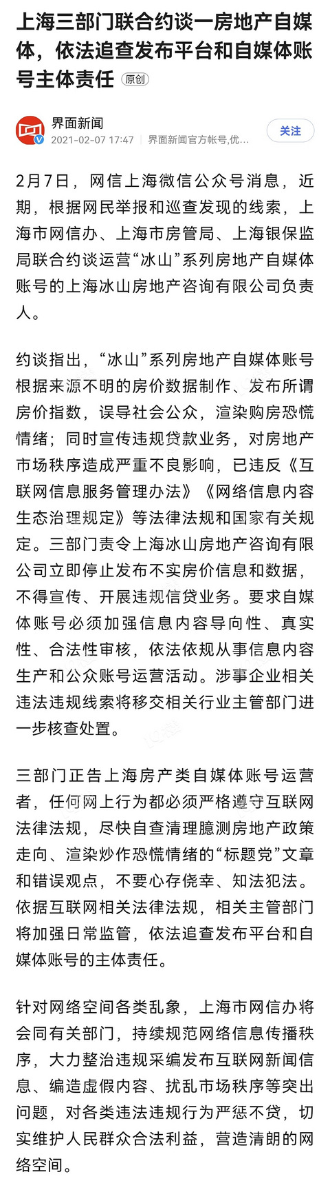 约谈指出,“冰山”系列房地产自媒体账号根据来源不明的房价数据制作、发布所谓房价指数,误导社会公众,渲染购房恐慌情绪;同时宣传违规贷款业务,对房地产市场秩序造成严重不良影响,已违反《互联网信息服务管理办法》《网络信息内容生态治理规定》等法律法规和国家有关规定。