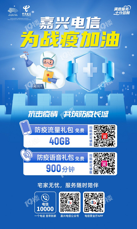 疫情无情人有情,凝聚力量向前行。嘉兴电信始终践“人民邮电为人民”的优良传统,向封控区、管控区、防范区内的人民群众开展流量赠送活动,具体如下:1、流量语音礼包内容:针对嘉兴电信手机用户赠送40G的流量(分2月赠送,每月20G),900分钟语音(分3月赠送,每月300分钟)。2、线上领取方式:嘉兴市范围内嘉兴电信手机用户扫描二维码登记领取。 广告