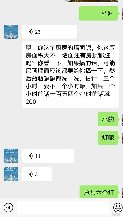 6平米的厨房!打扫完报价24小时!1200元!家政公司都把新客户当冲头吧!!!过年找了个叫尚新家政的公司,来家打扫厨房!报价50一小时,一个厨房一两百,最多三四百,我家的厨房不到6平方!结果当天陆陆续续来了5个人!因为是我爸找的家政公司,我以为这是正常的。结果一天下来走出走进,从8:30磨洋工到18:30,中午也在我家吃饭,晚上报价24小时!我的目的是清扫厨房!两个阿姨,把我厨房的碗搬出来,就开始