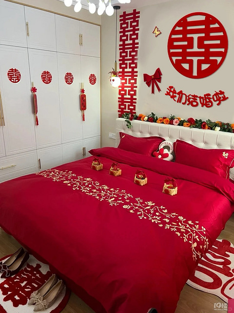 红红火火的颜色特别喜庆,床单用了传统大红色,面料全棉的,放了讨口彩的桂圆还有红枣,床头少不了鲜花,简单又不失喜庆,好看不失精致,自己喜欢才重要,红色代表幸福美满生活。