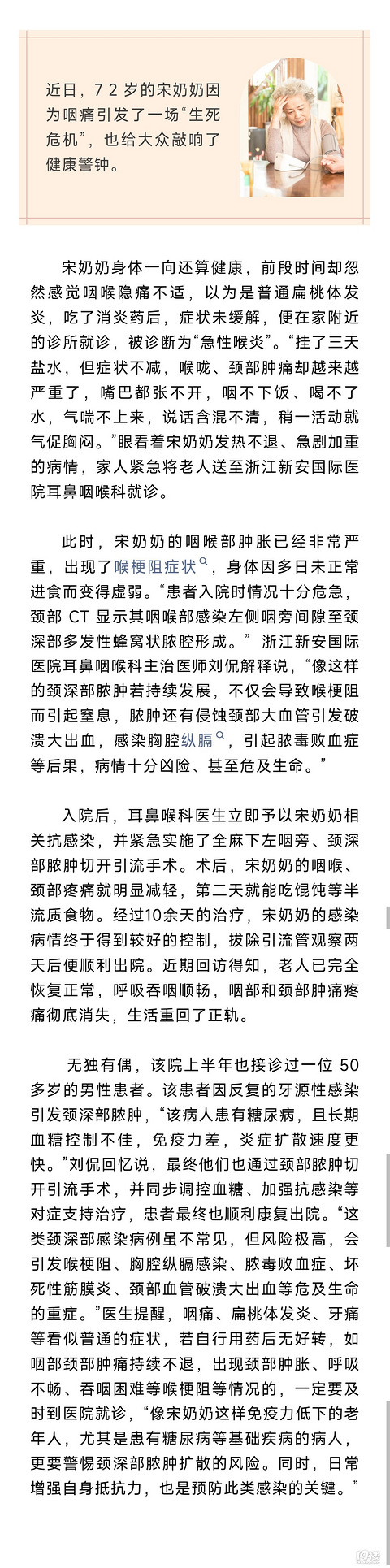 “以为就只是喉咙痛,谁能想到差点有生命危险!”医生提醒:别拖