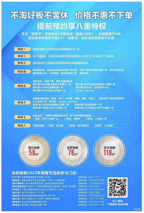 最近要装地板?先看龙森!连续15届的龙森木业“淘板节”8月21日龙森“淘板节”再度来袭!超低价格超值厂购 今天小编就来给大家详细讲讲深受人们喜爱的龙森地板8月的活动 不淘好板不罢休价格不惠不下单 活动提前预约可得VIP邀请函(全程限800份)可享八大特权! 强化板58元/平方起多层板78元/平方起!实木板 118元/平方起!都在这里大降价!!!更有8重特权等你来享受 活动时间:2022年8月21日