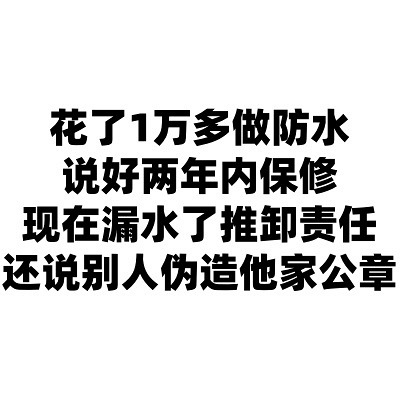 离了个大谱,楼友门有遇到吗?花了1万多在他们家做了防水,合同签订的两年内保修,现在有问题了房顶还在漏水,居然一会儿说员工离职了,他们管不了,一会儿说别人造假她家公章,现在应该怎么办?[/11捂脸][/11捂脸]
