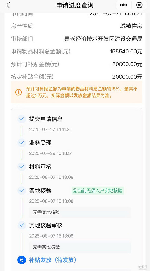 经历了99八十一难,艰难的国补终于算是下来了,我是经开区的,经开区的要求听说是最严格的,发票要求,照片要求啥啥啥的,然后申请后社区还要上门来看拍照片,一道道过下去,到了住建局,还要经过他们的提问,以防你造假,最后通过审批前跟你确认好银行卡,基本就算稳拿了,系统审核完毕后,如果没及时到账,等个几天就好了(我是这么经历的)