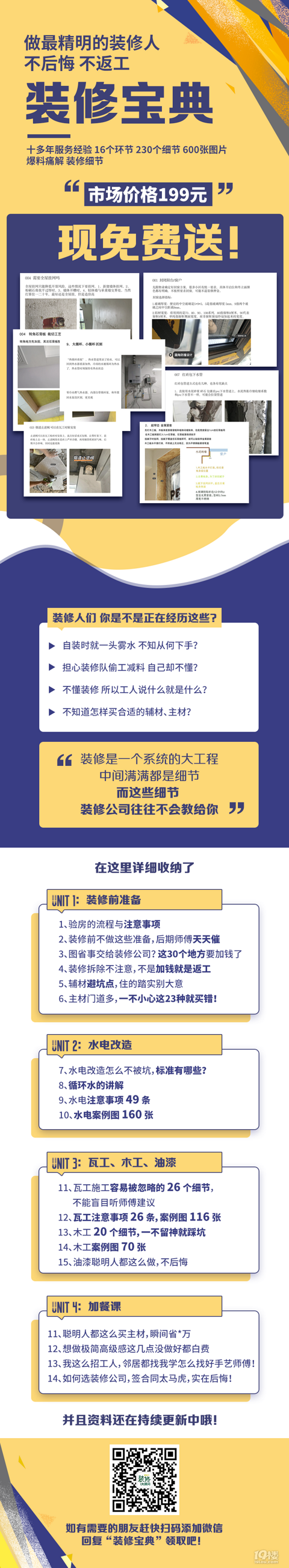 装修小白真的难!工人说什么就是什么还担心会被偷工减料装修细节又超多 一个不注意丢钱还吵架那快来领取 我们的装修宝典吧! 原价199 现由19楼免费赠送加我微信 马上安排!