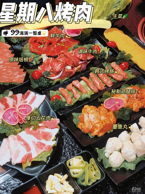 烤肉店接踵而来~近两年开了超级多~ 内卷的风很大店内装修比较炫酷的感觉一楼散台 二楼有两个包厢-店名:星期八烤肉酒馆定位:洪兴路928号人均:40元/人 某音买的99的套餐2-3人餐 超级划算7个肉 完完全全可以吃撑!!! 鲜牛肉:超大的一块肉是那种腌制入味的 想想就很好吃!烤的焦焦的剪开真的太快乐了吧-韩式烤肠:每次烧烤店必点~烤的焦焦的QQ弹弹的一口下去爆汁儿的赶脚太棒了-晚上约上自己的宝或者