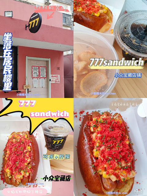 店名:777sandwich地址:友谊街8号(粉粉的建筑)推荐火焰龙虾热狗三明治配料:龙虾肠,玉米粒等+4元升级套餐(包括配餐+饮料)这个面包好软的,三明治真的很不错。配餐这个虾片有点辣辣的,但是很脆,nice。.饮料可乐+柠檬(mini杯)不一样的感觉,泡久的话。.现在处于试营业状态只能在门口就餐,或者打包带走。.到9.20号左右正式开业了可以去房车里面进行就餐。