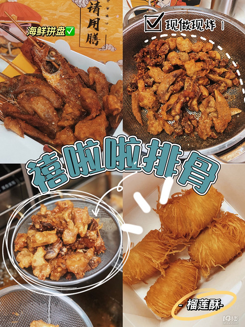 店名:禧啦啦排骨 地址:嘉兴学院越秀集市 人均:20元/人 越秀集市又开新店啦 就在进门口左手边 虽然叫排骨 但是还有很多别的小海鲜 炸物袄 店内主要以炸为主 很多炸物 套餐 (排骨鸡架鸡翅)套餐只需25.8元! 里面有三种东西一个套餐就可以足三种需求现炸之后 撒上快乐孜然粉和辣椒粉真的好恰 我口味重 选择的重辣-禧啦啦榴莲酥:12元/4个喜欢榴莲酥的宝们 有福啦现炸的榴莲酥 外皮脆脆的里面的榴