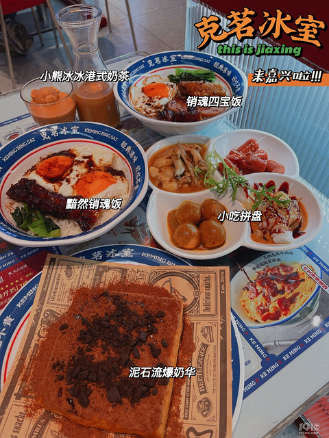 :克茗冰室·since1978(八佰伴店)八佰伴负一楼(B1FBL-10)深圳top 1的茶餐厅来嘉兴啦今天晚上路过竟然不用排队 直接进去了[调皮].?7?6.黯然销魂饭点了两份饭 还是推荐这个因为里面的叉烧是最好吃的配上太阳蛋绝了~酱汁和饭融合在一起 味道非常nice.?7?7.泥石流爆奶华一切开里面的牛奶都爆出来上面铺满了奥利奥碎 一口下去 幸福爆棚~.?7?8.小熊冰冰港式奶茶颜值很高