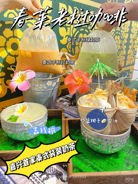 最近嘉兴被这家店刷爆了朋友圈 嘉兴首家终于在嘉兴也可以喝到正宗的泰式袋装奶茶啦-【具体信息】店名:春莱老挝咖啡地址:环城西路471号-【点单推荐】泰式手标绿奶茶小姐妹点了这一款 说味道超级正宗 评价说和在泰国喝到一样的味道 点了半糖加冰 绿茶味还是蛮浓郁的-泰式手标红奶茶我个人可能更爱红茶 喜欢茶味重的宝宝可以点这款特别的醇厚 加冰是夏天的快乐了-竹篮椰子沙冰样子就很独特 沙冰是用草编的竹篮装着