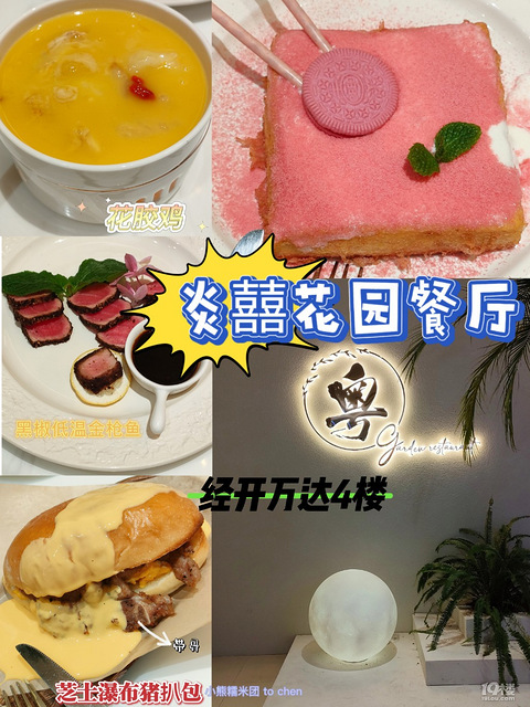 店名:炎囍花园餐厅地址:经开万达4楼(鱼司令旁边)粤菜环境拍照打卡地点超级好看的,花园一样的装饰。好适合小姐妹聚餐,约会.推荐花胶鸡特别适合女孩子。口感也不错。芝士瀑布猪扒包猪扒是带骨头的。旁边是有分开的芝士的,可以自己撒上去哦。口味还是不错的,带上手套吃更过瘾哦樱花珍珠西多士粉粉的,少女感十足里面的珍珠也是粉粉的,就是整体偏甜提醒:晚餐时间去,去的比较晚需要等位哦。