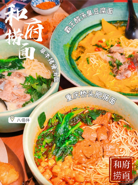 嘉兴终于开和府捞面啦,就在八佰伴负一楼,离我好近,约上小姐妹去尝尝鲜。 ———— 霸王酸汤臭豆腐面 最具有特色的一款,如果就只想吃一碗面的话,那么建议点这个。非常浓厚的酸汤味,带一点辣,没有想象中臭豆腐很臭的那种味道,值得一试。 — 草本猪骨汤面和府1号 比较养生的汤底,带着一点滋补的草药味。整体是清淡醇厚的猪骨汤。 — 重庆桥头肥肠面 味道很像重庆小面,里面还有豌豆,口味比较辣,肥肠很软烂。 —