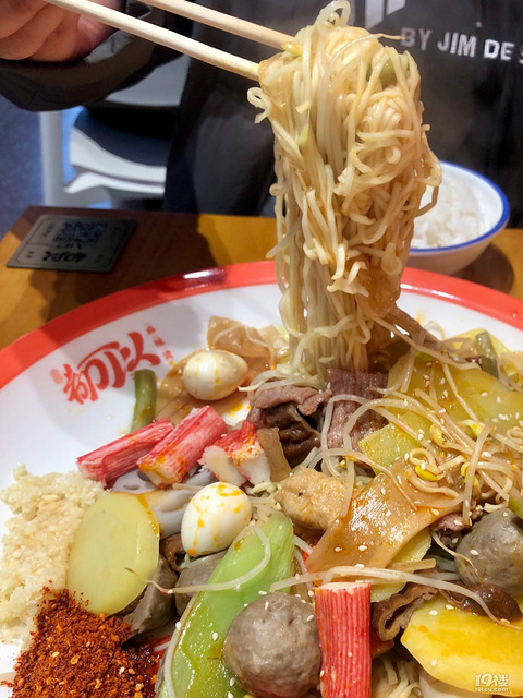 大盘子是他们的特色端出来一盆香喷喷干拌麻辣烫太香太香了!肥肠 嫩牛肉 小酥肉…统统都点上!真的吃一次就爱上盘子边上还有干料很巴适了都可以盘盘麻辣烫