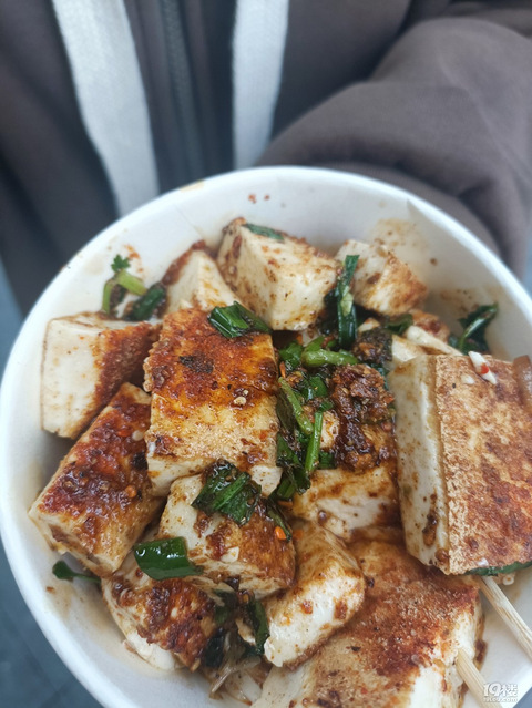 秀秀我侄女大老远给我带回来的铁板豆腐。表面上煎了一层脆脆的皮,外面撒了很多辣椒面还有孜然粉花椒粉,再拌上香菜和葱花,绝绝子。超级好吃