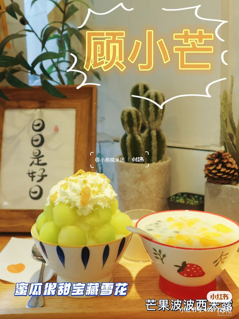 店名:顾小芒地址:真合路412号夏天的快乐就在这一家小小的店里。越秀集市附近。 蜜瓜很甜宝藏雪花奶油+蜜瓜+雪花冰—加入奶(冰融化了,混合吃绝绝子)夏天的快乐,就在这一冰沙里面,明年夏天再来吧 芒果波波西米露芒果颗粒+很多波波+西米露料真的好足啊。店里环境店里并不是很大,一排的座椅,上面的布置还是很好看的。建议夏天去的话一定要早,要不然会没有位置。甜品蛋糕、甜甜圈、雪媚娘都有哦可惜没有提拉米苏,要