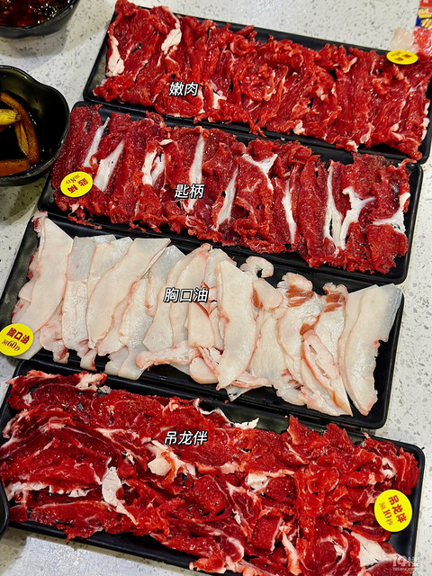 冬天就要吃暖暖的火锅呀火锅还得属潮汕牛肉火锅最过瘾大量新鲜现切的牛肉,一口下去也太满足了!这家好吃的潮汕牛肉火锅店推荐给大家「嫩肉」、「匙柄」、「吊龙伴」这应该是潮汕牛肉火锅必点菜品吧!都是现切的,涮的时间都用标签纸写着,几秒就能吃,很嫩!口感超好「胸口油」第一次吃胸口油,有点类似牛油的味道,还略带点脆脆的口感。这个一般性,不推荐「牛杂」有很多牛的部位,但是口感一般,不推荐。还是推荐点牛肉吃都不踩