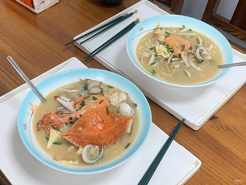 坐标:桐乡石浦海鲜面(桐乡中山东路505号)点了一份黄鱼面和梭子蟹群英荟萃面。2碗面价格118还是138?(有点忘记了!)手工面的质感,海鲜的鲜味,满满海货,爱死了!梭子蟹的季节怎么能错过这碗群英荟萃呢!一整个梭子蟹,蟹膏非常厚实,里面还有黄鱼、鱿鱼、蛤蜊、蛏子…………