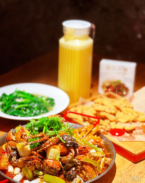 : 农心小馆·土菜(万达广场店):南湖万达广场4楼 秋风起,蟹脚痒,到了吃大闸蟹的季节啦!农心小馆推出了招牌蟹锅,那必须得尝一尝哇! 秘制大闸蟹锅特意数了一下,一锅有五只,个头很大,且肉质肥美,辅料有大虾,土豆,莴笋,年糕,满满一锅,都是秋天的味道,秘制的口味强推,吃到最后,麻麻辣辣的,太过瘾了! 小酥肉外焦里嫩,分量也很足,有番茄酱和干辣椒酱。不过我觉得蘸着蟹锅里的汁更好吃!炒时蔬用大蒜炒出来的